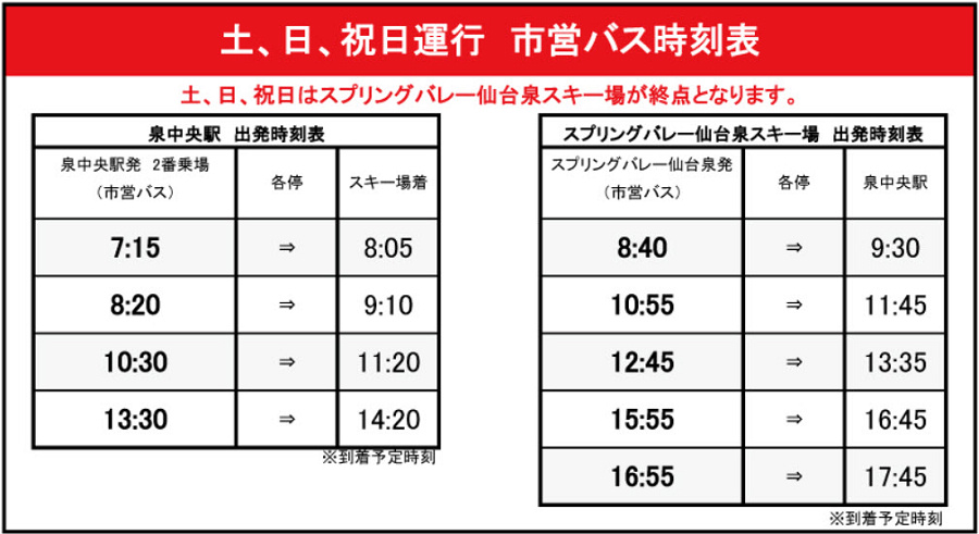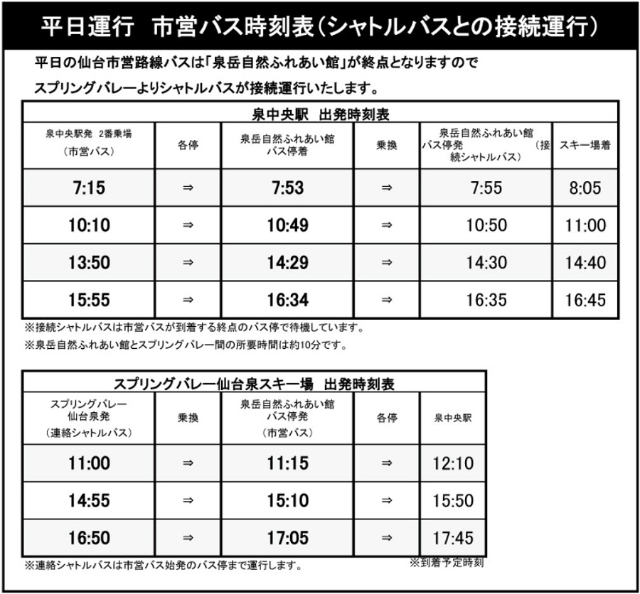 交通方面,要前往泉高原 Spring Valley 滑雪場,首先要從仙台車站搭乘地鐵南北線到最北端的泉中央駅 (16分鐘) ,接著再轉搭公車上山。公車的路線分成假日路線 (六、日、國定假日) 及平日路線 (週一~週五) ,都在同一個地點搭車。假日時公車會直接開往泉高原滑雪場,不需轉車。平日時公車則只會開到泉岳自然交流中心 (泉岳自然ふれあい館) ,而滑雪場會依公車抵達的時間,安排免費的接駁巴士從泉岳自然交流中心接駁乘客至滑雪場,回程亦同。以下就讓我們來看看轉乘教學。