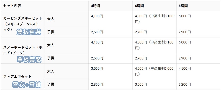 雪具的價格基本上是以款式、租用時間以及租用者年齡來區分。表格上的三欄為套裝組合,分別為 Ski 用具、Snowborad 用具、以及雪衣。時間上分為 4、6、8 個小時。