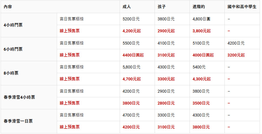 滑雪吊椅票價就如上所示,完整票價資訊請參考官網。另外也有販賣家族套票、夜間票、季票等各種優惠組合。