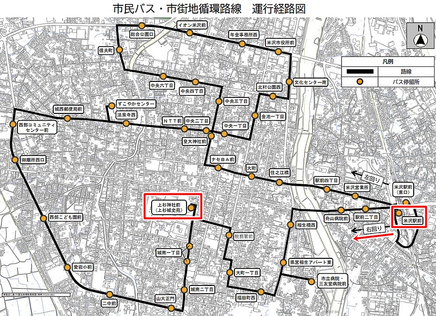 市內循環巴士分為右循環及左循環兩種,巴士會繞著米澤市區的重要景點行進。從米澤車站出發要前往上杉神社的話,要搭乘右循環巴士,約 10 分鐘可抵達「上杉神社前」。