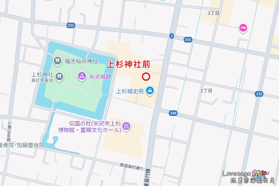 兩種巴士都是坐到「上杉神社前」下車,車站具體位置在上杉神社前的城史苑賣店旁 。