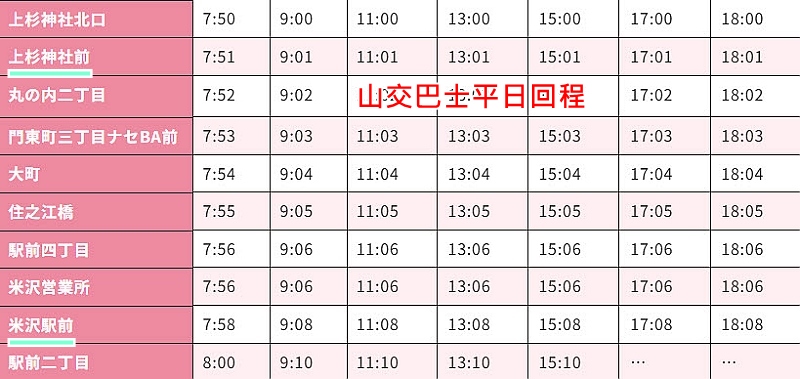 另一個方式是在巴士候車處的 2 號站牌搭乘山交巴士白布溫泉線,班表分為平日及例假日,上圖為平日的來回時刻表,其它時間詳見山交巴士官網,抵達上杉神社的時間同樣是十分鐘。