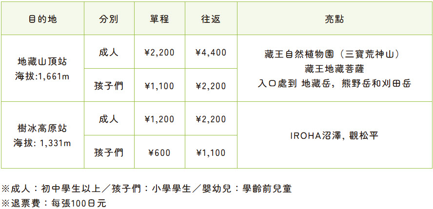 從山麓站搭乘纜車上山,途中會在「樹冰高原站」換車,轉搭另一台小型的纜車前往「山頂站」!下山時同樣也會搭乘兩段纜車,因此纜車票上一共有四個打卡孔。票券在使用完畢前請妥善保管不要弄丟了。