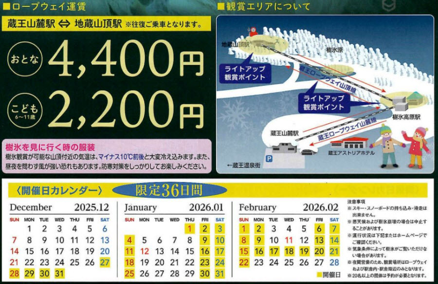 藏王樹冰纜車在冬季的每日都有運行,但夜間纜車僅於 2025/12/27~2026/02/22 期間開放 36 天,日曆上標註黃色的日期皆有夜間纜車。