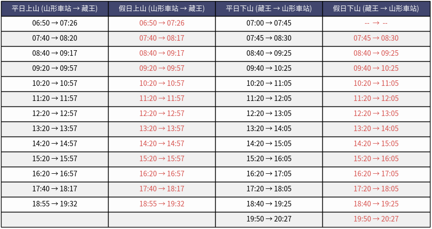 從山形車站到藏王溫泉的巴士時刻表,上山的時刻不論平假日都一樣。但下山的部份在平日早上會比假日多一班 07:00 的車次。(班次時間以官網公佈為準)