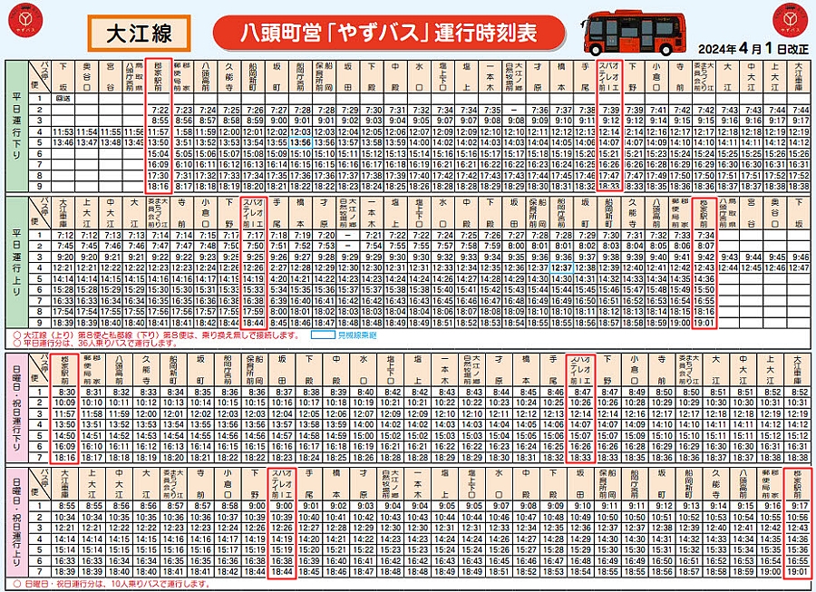 ➤ 搭乘大眾運輸工具 由鳥取市乘座JR因美線至「郡家駅」,再從郡家駅搭乘巴士「やずバス大江線」(往大江方向)約20分鐘至「オオエバレーステイ前」下車。巴士單程¥100。 やずバス大江線 時刻表 / PDF (2025.12)