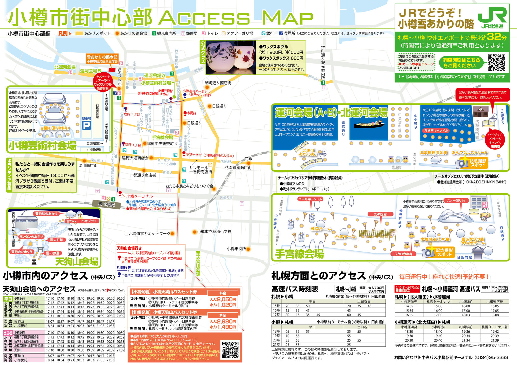 前往小樽的交通方式非常簡單,搭乘大眾交通運輸工具即能抵達。 抵達小樽後,可以步行前往各個雪燈路會場,如小樽運河會場、舊手宮線會場和小樽藝術村會場。如果計劃前往天狗山會場,則需在火車站前搭乘公車 (9 號) 前往天狗山纜車站,並轉乘纜車上山。