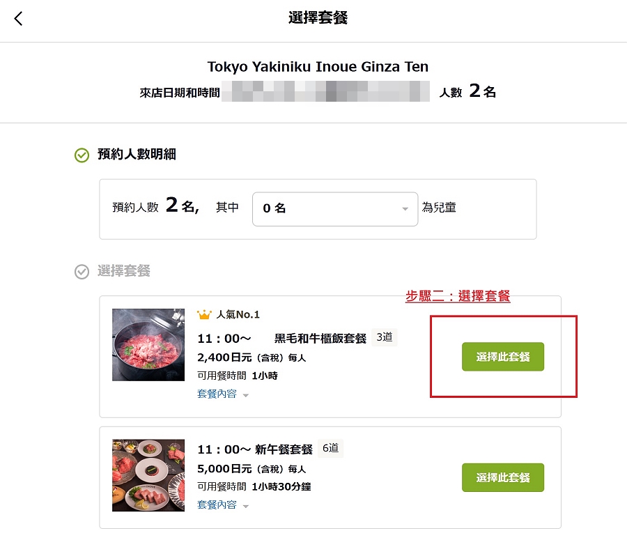 步驟二:進入套餐選擇畫面。如果您是預約中午時段,頁面上只會顯示兩種午間套餐:和牛蓋飯套餐與燒肉套餐。最受歡迎的就是上方的和牛蓋飯套餐,2025 下半年價格已調整為 2,400 円,但在許多饕客心中依然CP值超高的選擇。