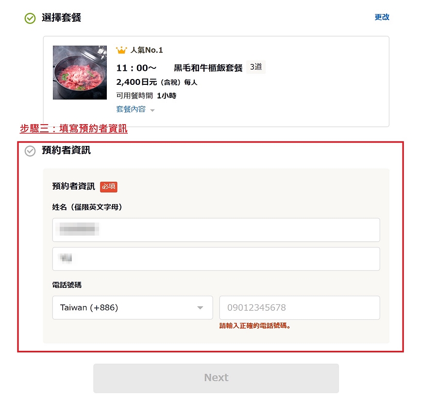 步驟三:進入填寫預約者資訊的畫面,只要依序輸入英文姓名和聯絡電話,按下 Next 鍵就能進行到下個步驟。