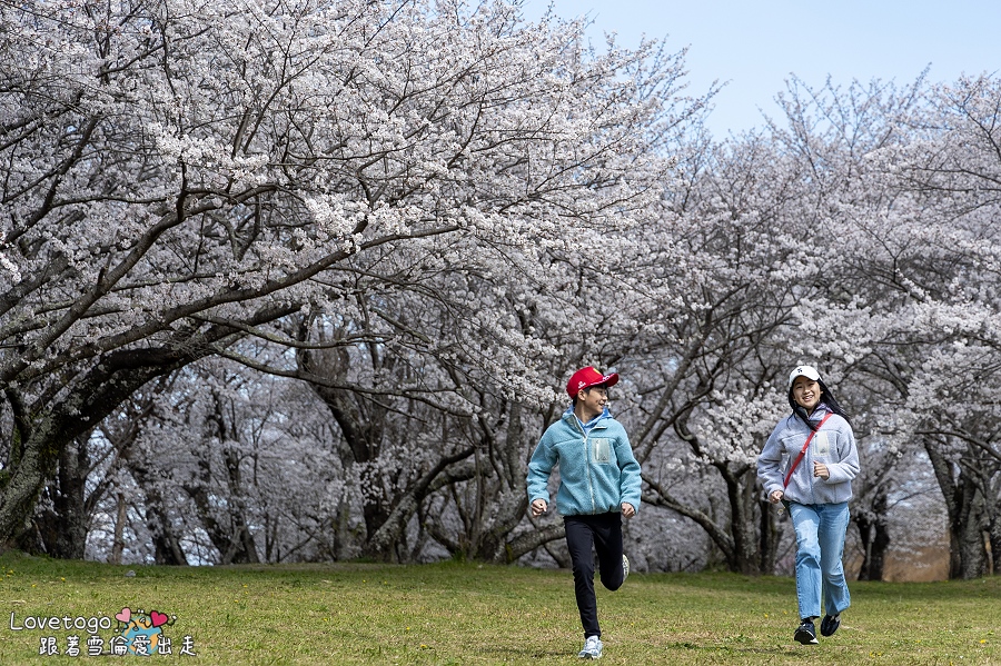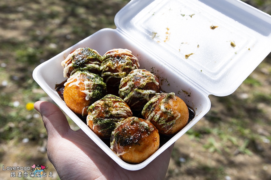 沿著堤防,櫻花樹下有許多空曠的草皮,許多當地人都帶著野餐墊,在櫻花樹下享用美食。我們則是找了塊乾淨的草地,直接席地而坐,享受道地的章魚燒。