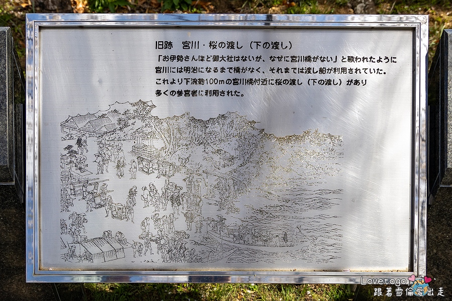 舊蹟 宮川櫻之渡口 當時,人們吟唱著「沒有比伊勢神宮更偉大的國之大社,為何宮川上卻沒有橋?」,事實上,宮川直到明治時代都沒有架設橋樑,在此之前人們都是利用渡船往來。現在的宮川橋附近,便是以前的櫻之渡口,曾被許多前往參拜的旅客所利用。