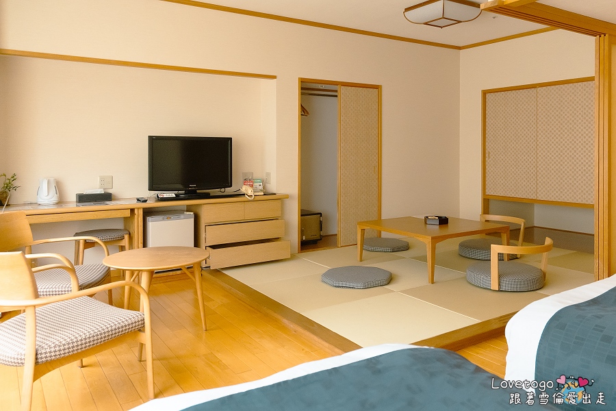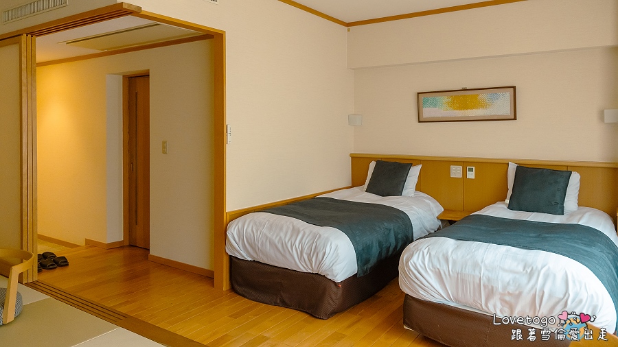 這次我們入住的是水明館「飛泉閣」的和洋式房型。一推開房門,榻榻米淡淡的清香撲鼻而來,心情隨之沉靜。房內配置了柔軟的雙人床及日式床墊,完美結合了日式的靜謐與西式的舒適。房間空間寬敞且採光極佳,陽光灑進來的時候整個氛圍特別溫暖。坐在榻榻米上喝茶,或是直接躺到床上休息,都很自在,還沒開始走出屋外就感覺被治癒了。