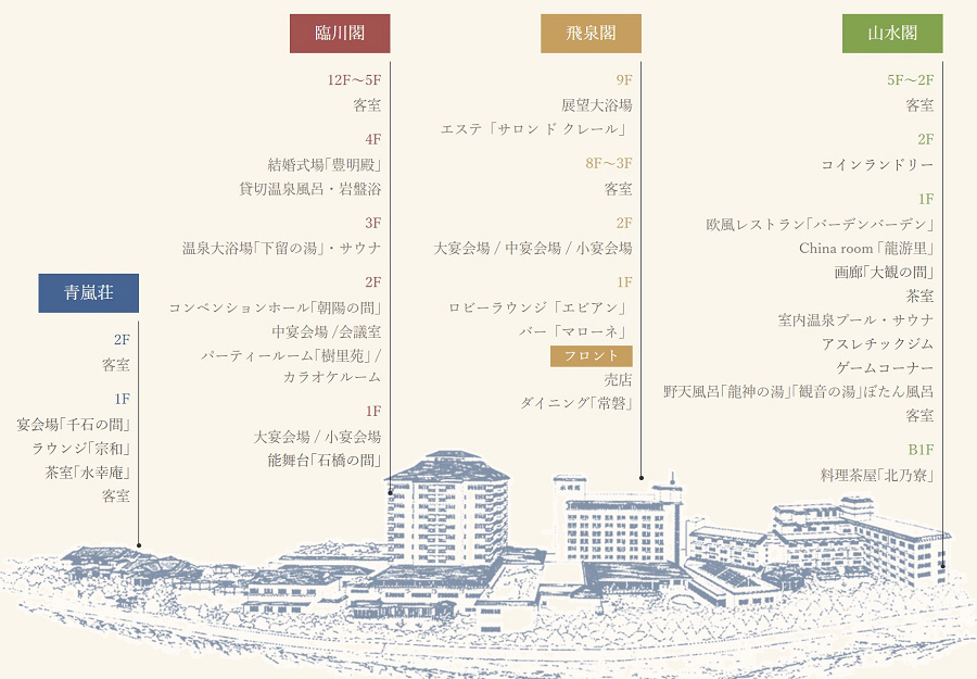 水明館共有四棟建築物:青嵐莊、臨川閣、飛泉閣、山水閣。每棟各有不同特色,不論入住哪一棟,都能透過館內的連通道連結至各館,所有的公共設施及大浴場都可共用。