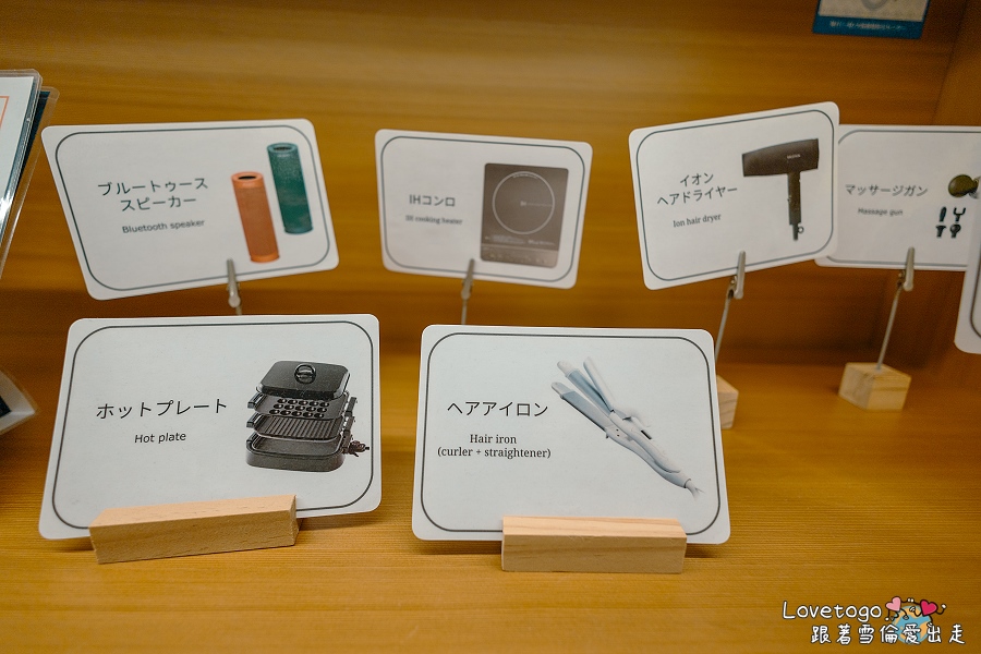 MIMARU 大阪心齋橋 EAST 也貼心提供了各式各樣的租借用品,從日常會用到的電器用品 (喇叭、筋膜槍) ,到實用的廚房小物 (例如烤爐、IH電磁爐、調味料組) ,甚至連美容用品 (像是捲髮棒、負離子吹風機) 都有提供。只要到櫃檯告知想借用的物品,工作人員就會協助登記並交付用品,而且這些租借服務完全免費,不需要額外付費,真的非常佛心!