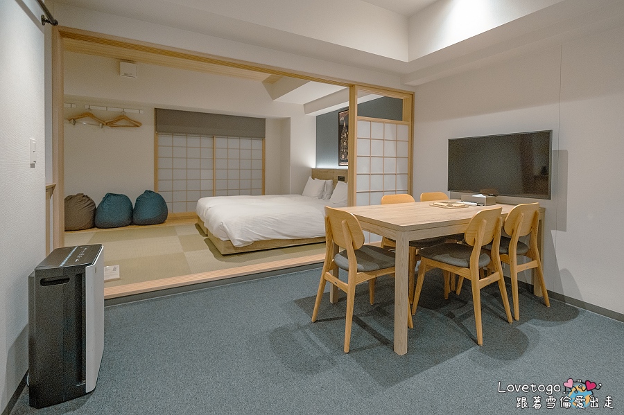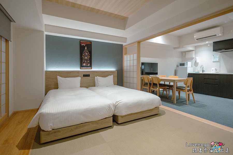 有別於熱鬧可愛的寶可夢主題房,MIMARU 的一房式日式公寓則以簡約沉穩的設計風格,深深擄獲我的心。房間以手拉門巧妙區隔餐廳與臥室空間,既保有開放感,又能兼顧隱私。