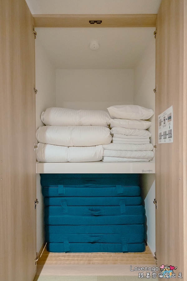 房間的櫃子裡準備了三張日式床墊,包含保潔墊、床單、枕頭和棉被,睡前只要拿出來鋪在榻榻米上,就能變成柔軟舒適的床。第一晚,孩子們一看到床墊就興奮不已,搶著幫忙鋪床,邊鋪邊笑,歡笑聲在房間裡迴盪,讓原本平凡的夜晚增添了許多樂趣。