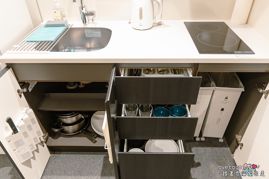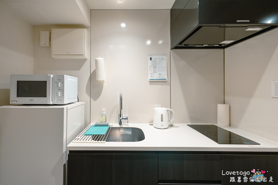 廚房設備一應俱全,包含 IH 爐、微波爐、冰箱、電熱水壺,以及基本的鍋碗瓢盆與餐具,方便旅客自行料理。無論是早上煮杯熱茶、準備簡單早餐,或是晚上動手煮一頓晚餐,都非常方便。