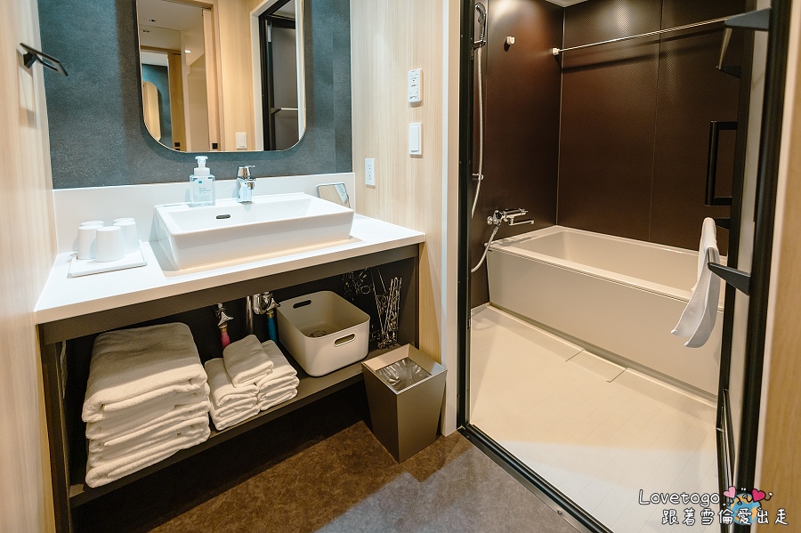 浴室設計簡約實用,採乾濕分離配置,讓洗澡與洗手台、馬桶的空間互不干擾。浴室內備有獨立的淋浴間與浴缸,隨時可以泡個熱水澡放鬆一下。MIMARU 的房間內不主動提供一次性備品,若有需要,可向櫃檯索取免費備品。