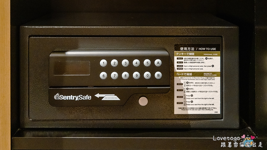 房間的櫃子裡設有一處隱藏式保險櫃,建議出門前可以將貴重物品鎖進保險箱裡,讓人外出時更安心。不過提醒大家,退房前一定要記得檢查保險箱,確保所有物品都已取出。