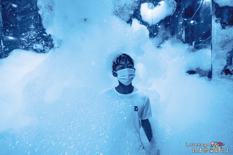 離開展區時,工作人員會拿著強力噴槍幫大家把身上的泡泡清理乾淨。出口處也貼心地設有洗手台,方便大家洗掉皮膚上殘留的泡沫。小威力玩得太投入,整顆頭都被泡泡包圍了,一碰到水就起泡,像在洗頭一樣。最後只好在洗手台稍微沖洗一下,才恢復清爽模樣。這段小插曲也讓大家笑成一團,成了家人心中最可愛的回憶。