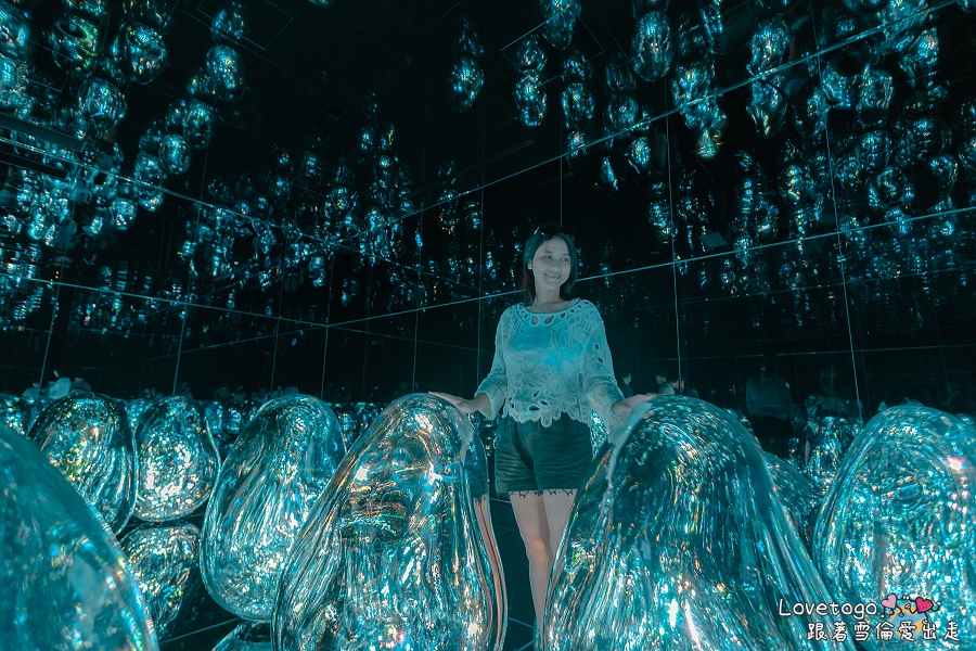 這個作品並不陌生,在東京豐洲展區裡也有相同的作品。《Resonating Microcosms - Solidified Light》 是由許多蛋形光體組成的互動作品,白天它們會反射周圍的景色,晚上或在黑暗中則會自己發光,展現出 teamLab 特別設計的 32 種光的顏色。當人們觸碰光體時,它們會發出聲音並改變顏色,周圍的光體也會跟著共鳴,形成連鎖反應;當人靜止不動時,光體會緩慢閃爍,反映環境的變化。整個空間會因人的行為與自然因素而改變,請靜下心來感受您與光體之間的連結。