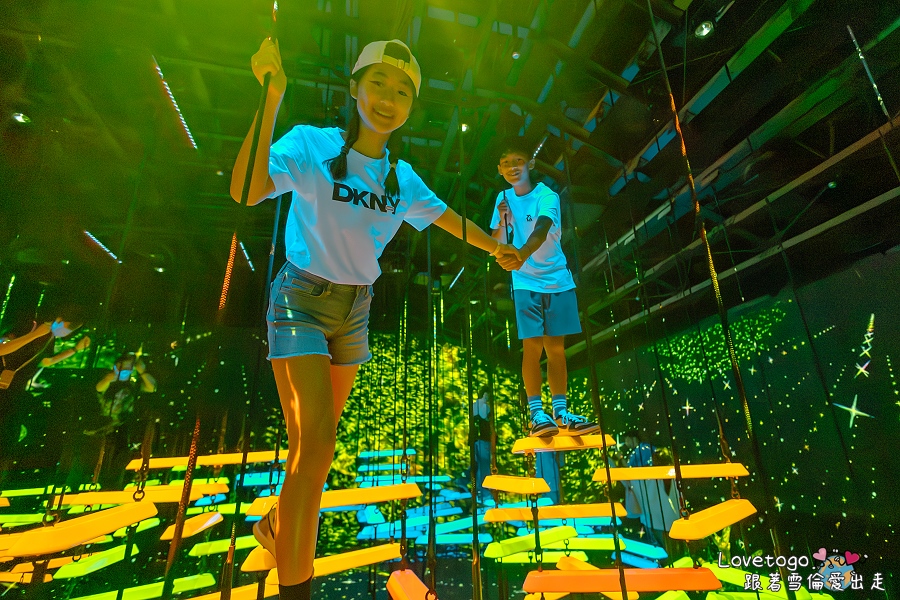 《Aerial Climbing》 是個空中探索空間,在懸掛於半空中的彩色橫桿上移動,一人晃動會影響其他人,彼此連動。每根桿子會發出光茫與聲音,越多人參與,聲音越豐富。空中有鳥群飛翔,靠近人時會染上人所站桿子的顏色,形成美麗又神秘的色彩變化。上次前往東京豐洲展覽時因維修沒機會玩到,這次終於能體驗,小孩玩得好開心!