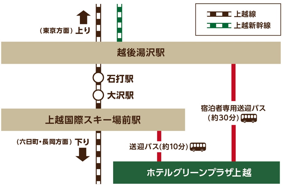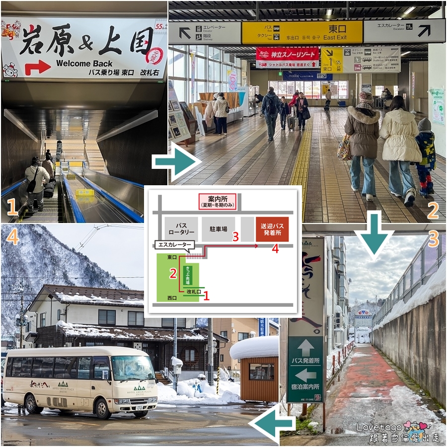 從東京搭乘上越新幹線,大約 70 分鐘就能抵達越後湯澤站!抵達車站後,接下來的交通方式會分為兩種路線:一種是純滑雪客,打算直奔上越國際滑雪場」滑。另一種則是準備入住上越綠廣場飯店的住宿客,兩者的搭車方式會稍微有點不同。