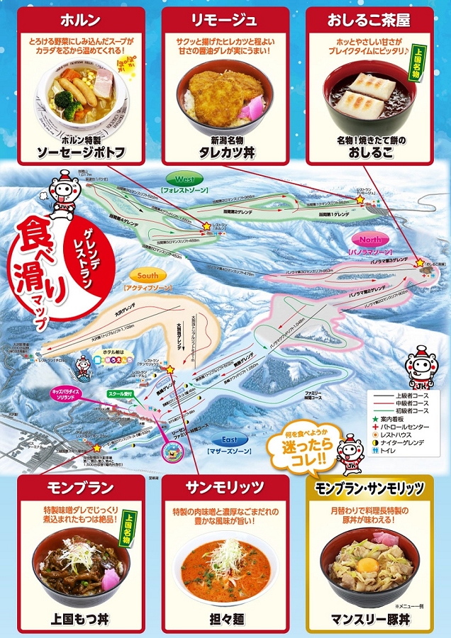 除了飯店裡的「桃李」和「MONTE ROSA」自助餐,整座雪場還散落著好幾間餐廳。雪場非常貼心地準備了美食地圖,建議大家把這些餐廳當作滑雪的目標!像是先想好中午吃哪間、下午茶吃哪間,再來規劃滑雪路線,滑起來絕對更有動力!
