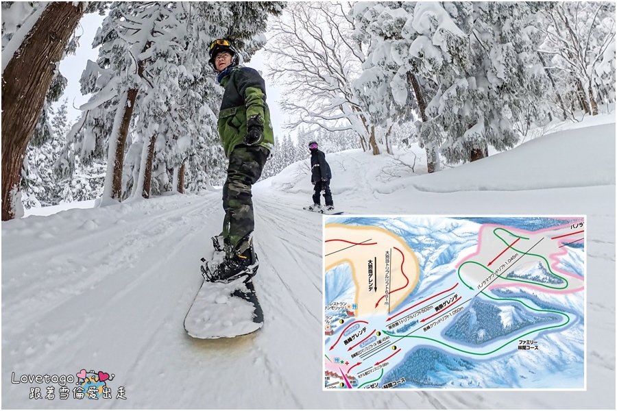 全景區是我們家最喜歡的區域!區域內有三條主要的紅線,終點都會匯集到「紅豆湯茶屋」。這區山上的雪質很鬆軟,坡度也很平均,不會忽平忽陡,滑起來超級順暢。我們這三天在這裡來回滑了七、八趟,滑累了就直接衝進茶屋喝碗熱呼呼的紅豆湯,非常完美!