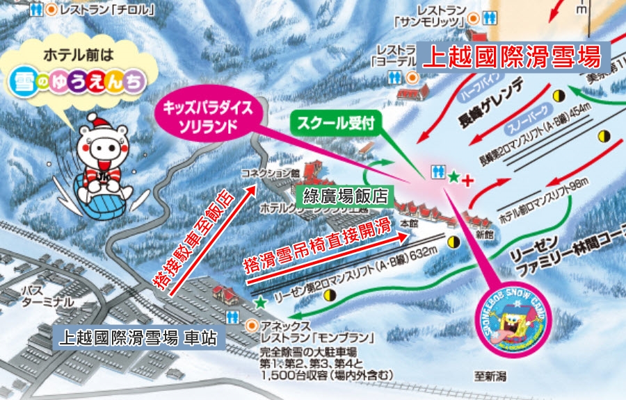 在上越國際,經常會看到許多日本學生在這裡上滑雪課。他們的活動動線主要是從飯店前搭乘兩段纜車抵達「全景區」,再沿著平緩的「森林綠線」一路滑下來。這條路線對 SKI (雙板) 新手來說非常友善;但如果你是玩 SNOWBOARD (單板),遇到大雪時千萬別進「森林綠線」!不然就會像我們一樣卡在平緩的路段動彈不得,最後只能全程脫下雪板,苦命地用走的下山。