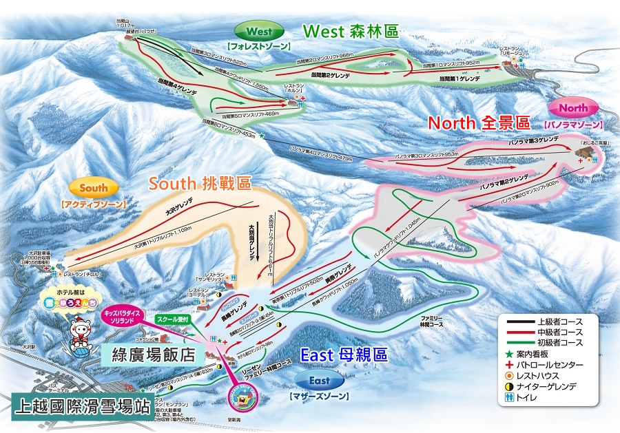 上越國際滑雪場版圖很大,主要分成四個區域。走出飯店就是藍色的「母親區」;搭兩段纜車上去,會抵達我們家最愛的「全景區」;接著再轉幾段纜車,就能攻頂到「森林區」;另外還有一區橘黃色的「挑戰區」,是坡度最陡的魔王關。