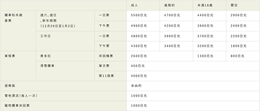 上表為 2025~2026 年的現場購票價格,建議優先在網路上購買折扣票券,包括:纜車票 以及 纜車票+租雪具。