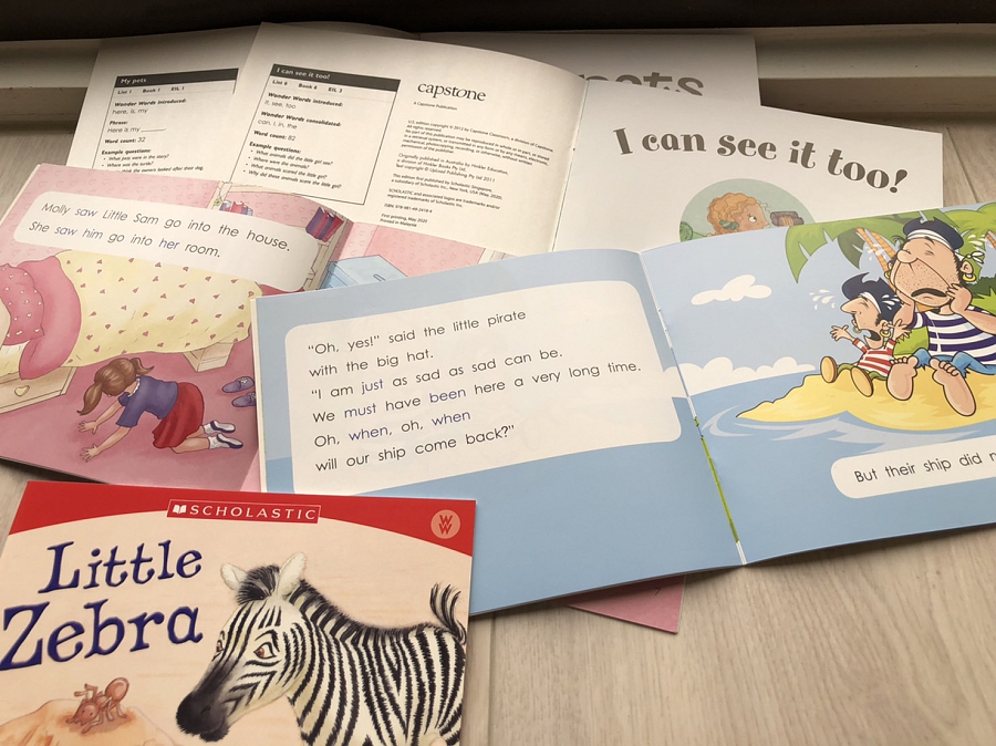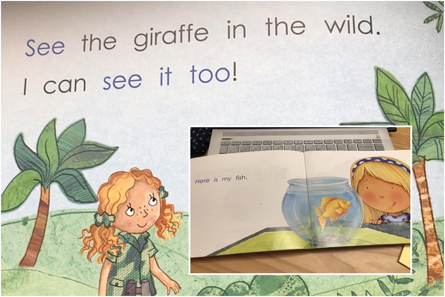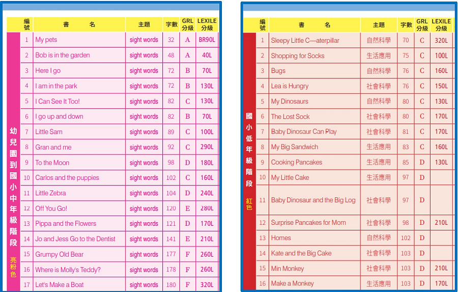 以最初階的亮粉色為例,這個階段處於認字階段,所以本子裡會出現大量 Sight Words (常見字),這個設計是在閱讀發展的初期,希望孩子能達成「自動化閱讀」的能力,就像看到媽媽、麥當勞會發出正確的發音。所以 Scholastic 初階 (如亮粉色、紅紫色) 會設計得很簡單,就是為了大量累積 Sight Words 的使用頻率。 在重複又重複的過程中,熟悉高頻率單詞,讓孩子加深印象。
