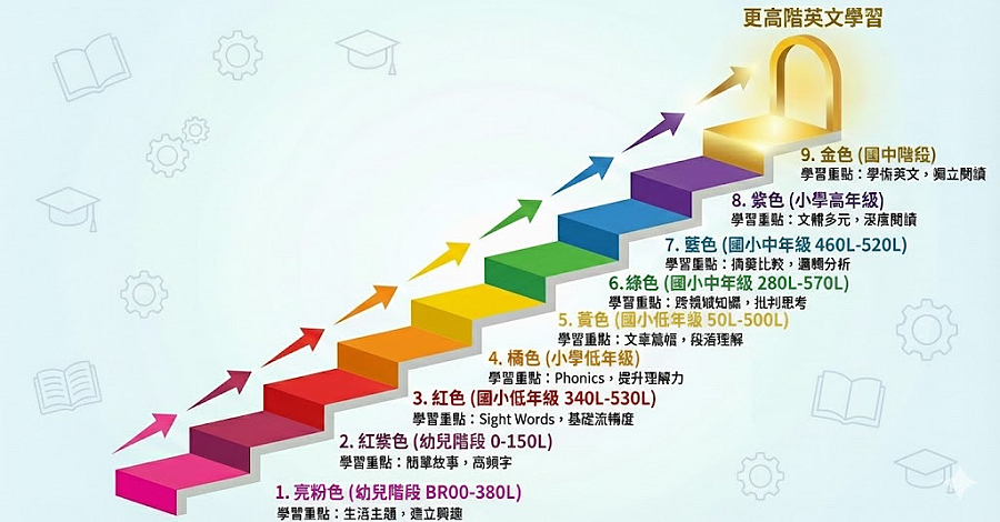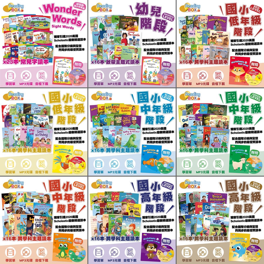 全新的 Reading Box 和 Everyday Book Box 最大的不同,就是更強調「系統性」和「循序漸進」。套書分成九級 (Level 1~9),用顏色來區分級別,從低階至高階分別為:亮粉色、紅紫色、紅色、黃色、藍色、綠色、橘色、紫色及金色。每個顏色都對應到適齡年級或藍思分數,非常方便讓家長幫孩子挑選適合的級別。
